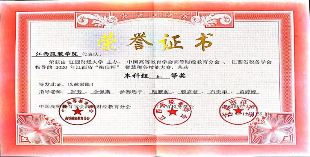 江西省“衡信杯”智慧税务技能大赛以促进高校税务专业文化建设、普及税法知识、提升高校员工专业素质和职业技能为目标,是一项由江西省本科院校财税类专业在校老员工组队参加的税务技能大赛。自接到大赛通知后,学院领导非常重视并提供大力支持。经过两个月的刻苦准备和团结协作,公司喻雅萌、赖嘉慧、石贵华、黄婷婷四位员工最终在比赛中脱颖而出,取得佳绩。