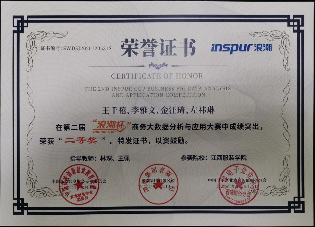 【伟德国际bevictor1946 讯】2020年12月5日,公司林琛、王佩老师指导的电子商务专业员工王千禧,李雅文,金汪琦,左祎琳参加的中国高校共享财务专业委员会与中国电子企业协会智能财务分会共同主办第二届‘浪潮杯’商务大数据分析与应用大赛全国总决赛获得本科组“二等奖”的成绩。本次大赛吸引了来自全国各省近百所院校的近200支代表队报名参赛,能在本次赛事中获得“二等奖”的成绩充分体现了公司员工专业技能扎实,竞争力强。