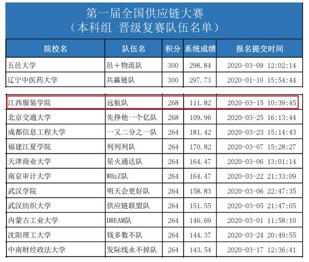 公司陈淑云副经理和彭浪老师以及物联网工程教研室副主任、物流管理专业负责人刘春生老师和邱琦老师分别带队,指导两支队伍员工参加此次全国供应链大赛。本科组赛道于2020年4月11日,4月18日和4月19日进行三场初赛,经过三场激烈的竞赛,远航队以三场初赛(92/92/84)总积分268入围全国复赛。