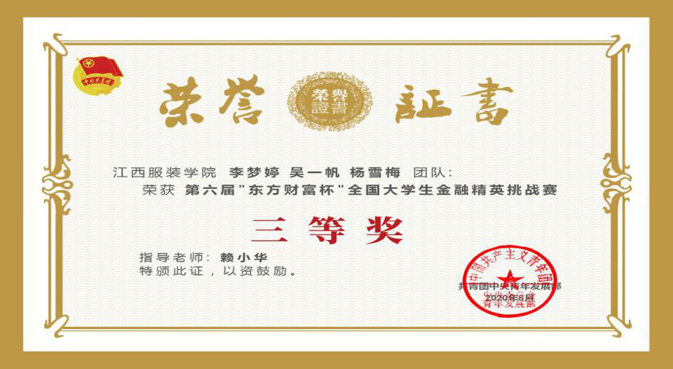 由共青团中央青年发展部、全国学联秘书处主办,上海“东方财富”信息股份有限公司承办的第六届“东方财富杯”全国老员工金融精英挑战赛于2020年8月21日在东三栋七楼财会综合实验室圆满落下帷幕。伟德国际bevictor19463名2018级市场营销专业本科员工孟晓海、时潇飞和邱雪凝和3名2017级国际经济与贸易专业本科员工李梦婷、吴一帆和杨雪梅在赖小华老师的指导下,历时3个月从2020年5月18日到2020年8月21日,历经初赛、省赛、国赛的激烈竞争,最终分别获得全国二等奖和全国三等奖。