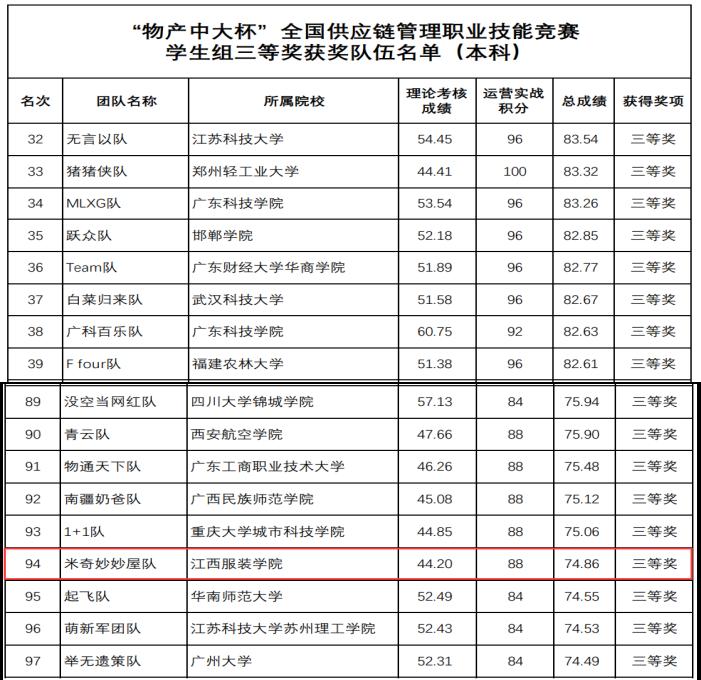 据悉,“全国供应链管理职业技能竞赛”主办单位为中国工业经济联合会、中国就业培训技术指导中心;承办单位是中国物流与采购联合会、浙江省商务厅、物产中大集团股份有限公司、浙江经济职业技术学院。本次大赛有706支院校队伍参赛,天津大学、华南师范大学、广州大学、深圳大学等高校均有参赛,大赛最终按理论成绩和运营成绩总积分排名。旨在通过竞赛促进供应链管理师人才队伍建设,推动现代供应链创新与应用发展。下图为竞赛获奖名单。