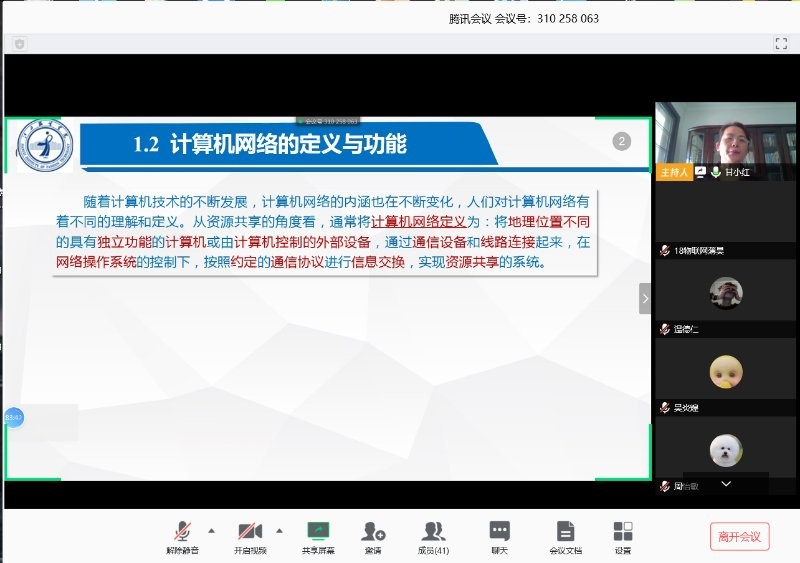 今天是18物联本科1班《计算机网络》在线开出的第一堂课,这对如何尽快地引领员工走进这扇学习计算机网络技术的大门是很重要的一步。因此我设计的课程从我们身边计算机网络的应用实例开始,注重使员工认识本门课程的地位、任务以及它的重要性。通过今天的课程使员工们了解了计算机网的产生与发展、定义、组成、拓扑结构、现阶段我国互联网新技术的发展,认识了物联网、云计算、5G等新技术的前沿,为后续章节的学习铺垫了知识的力量。