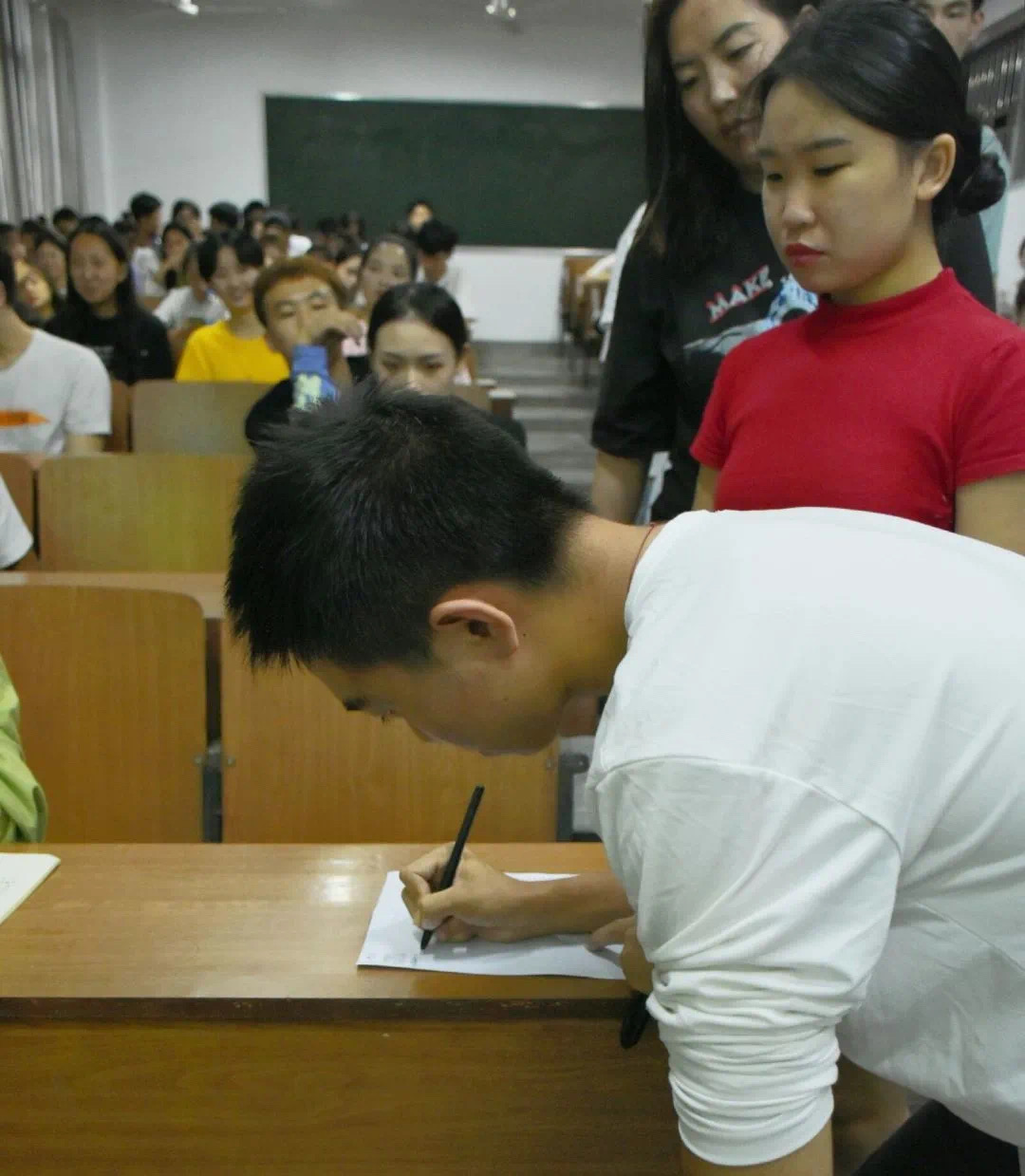 合唱团歌《光荣啊,中国共青团》后,主持人李俊辉的发言拉开了活动的帷幕,随后钟叶琴同学向大家分享了关于中国粮食安全的问题和自己的感受,期间她还提出问题,与台下的同学进行互动。钟叶琴同学的分享结束后,主持人给大家播放了袁隆平院士年轻时,在艰苦条件下研究杂交水稻和他接受央视采访的相关视频。在观看完视频后,同学们纷纷表示每一粒粮食都是来之不易的,以后会珍惜每一粒粮食。随后,伟德国际bevictor1946团委员工副书记吴家雯宣读光盘行动倡议书,提倡同学们要养成健康合理的就餐方式,以节约为荣,浪费为耻。剩饭菜打包,理性消费,摒弃“爱面子”、“讲排场”陋习,积极加入光盘行动,适量取食不随便剩饭,珍惜粮食,拒绝浪费,记心间。最后,各班级代表在倡议书上签字。