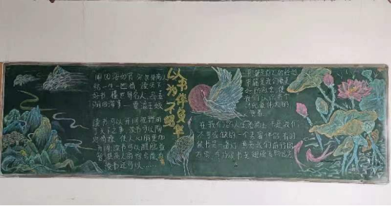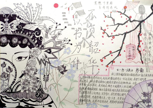 作品介绍:这次手抄报主题是“书香伴成长”。而“书香”二词让我不由自主想到古诗文中常常提到的梅,兰,莲,竹这四种植物,它们所蕴含的某种精神品质,是值得我去学习的,尤其是在读书的路上更能激励我前行,毕竟“最是书香能致远”。左边是京剧中花旦的角色,为青年或中年女性的形象,我很喜欢京剧中的服饰,这也更加映衬了我们学校的特色,扇子的图案正是莲花,象征着希望我们青年一代尤其是女性更要珍惜韶华,潜心读书,因为读书是一个让你变得更加辽阔的过程。中间以江南水乡的建筑为铺垫,因为我喜欢“人人尽说江南好,游人只合江南老”这句描写江南的诗词,这让我更加为文字所打动。