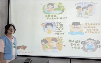 在防溺水安全知识宣传中,青年志愿者们通过生动有趣的动画视频及PPT,让孩子们认识到了私自下水游泳的危险,并了解了预防溺水的措施、溺水时的自救方法和同伴溺水后的应对方法。在互动环节中,志愿者提出了许多有关防溺水安全知识的问题,孩子们积极回答,每个人都获得了小礼品。