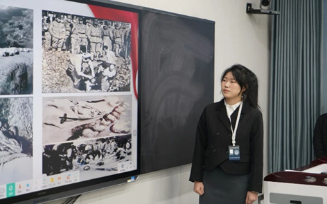 宣讲中,彭宇茜同学以其饱满的热情和深厚的历史知识,向在场的师生们展示了南京大屠杀这一沉痛的历史事件。通过详细讲述1937年七七事变后的历史背景、南京保卫战的失利以及南京大屠杀的惨痛过程,彭同学不仅揭示了日军的残暴行径,更强调了铭记历史的重要性。她提到,南京大屠杀不仅是对中国人民的极大伤害,也是对人类尊严的严重践踏。此次宣讲活动在教室内引起了强烈的共鸣,师生们共同缅怀在南京大屠杀中遇难的30万同胞,并深刻反思战争的残酷与和平的宝贵。彭同学呼吁大家要以史为鉴,努力学习,为实现中华民族的伟大复兴贡献力量,展现了新时代青年的责任感和使命感。
